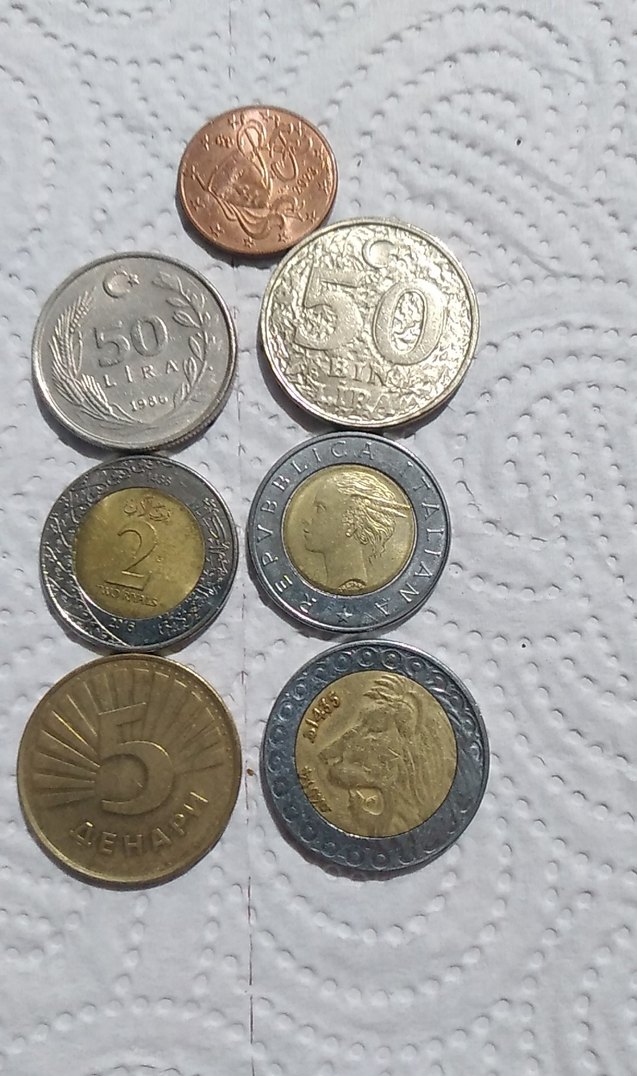 Altın ve gri tonlarda, 50 Lira ve 5 Leva gibi değerlerin bulunduğu para koleksiyonu, beyaz dokulu yüzeyde sıralanmış.