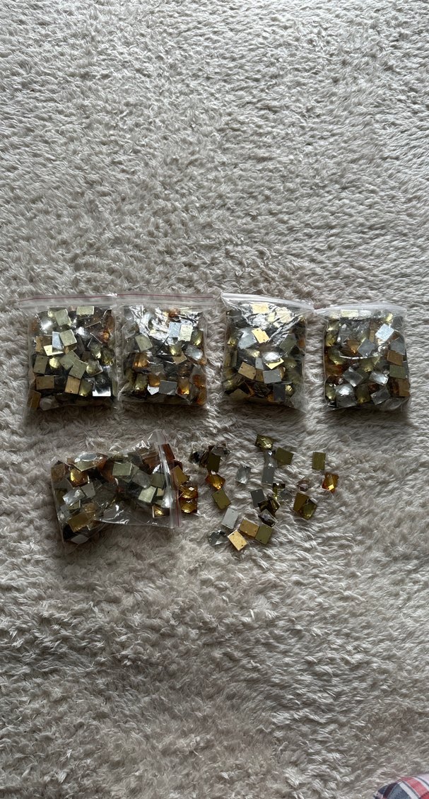 Altın ve gri renklerde, küçük tırnak süslemeleri, ayrı poşetlerde yer alır. Tırnaklara parlaklık katmak için uygundur. ✨