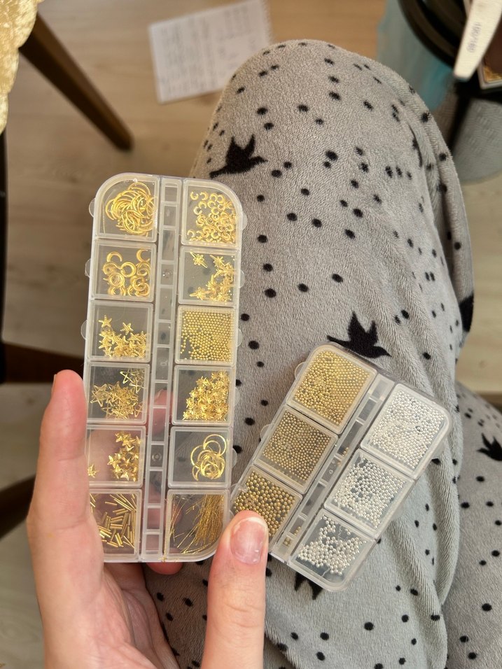 Altın ve gri renklerde çeşitli tırnak süslemeleri, düzenli kutularda bulunur. İkisi 300 tek fiyatları 150-150 uzun olanı 179a aldım küçük olanı 200e herşekilde indirime denk geliyor 1 kere kullanıldı çok kullanılmwdı