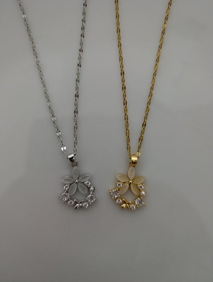 Kısa uzunlukta, altın ve gümüş renklerinde çiçekli kolyeler, zincir detaylı ve günlük kullanıma uygun modern klasik tasarım.
