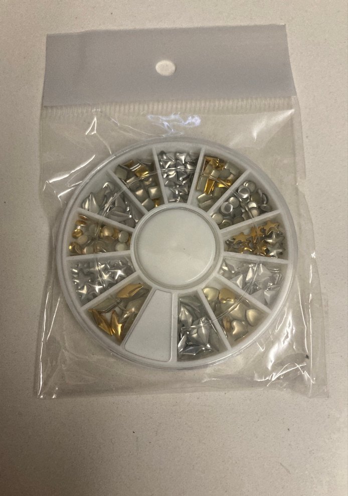 Çeşitli şekillerde altın ve gümüş tırnak süsleri, kolay kullanım için yuvarlak kutuda düzenlenmiştir. ✨