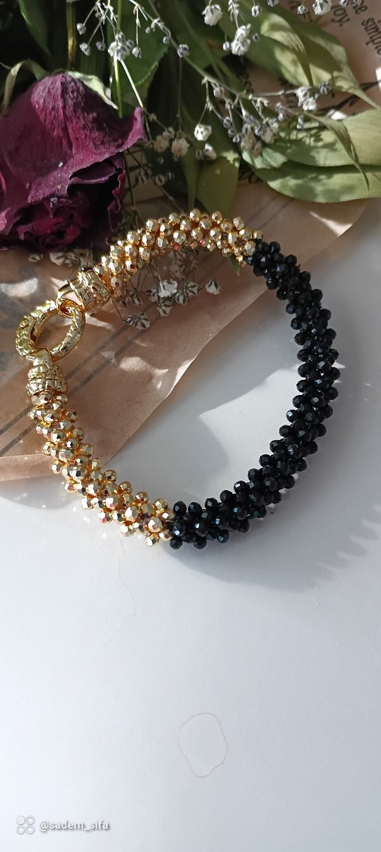Altın ve siyah boncuklardan oluşan, klasik ve çağdaş tarzı birleştiren bileklik. Düğünler için uygun. ✨