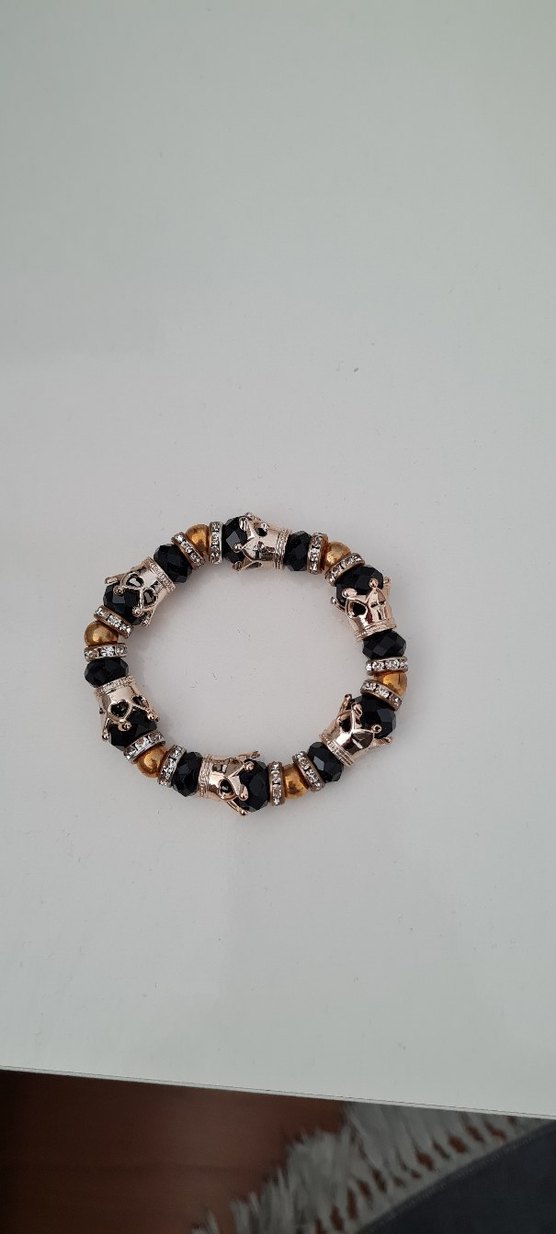 Kadın bileklik, yılan desenli altın ve siyah boncuklar ile taç motifleri taşıyor, gotik ve gösterişli tarzı bohem bir görünümle birleştiriyor.