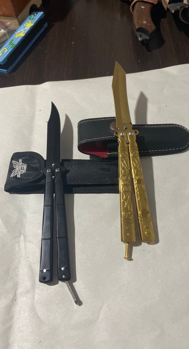 Altın ve siyah renklerde, detaylı saplara sahip iki kelebek bıçak ve siyah taşıma kılıfı. ️ Adet 700