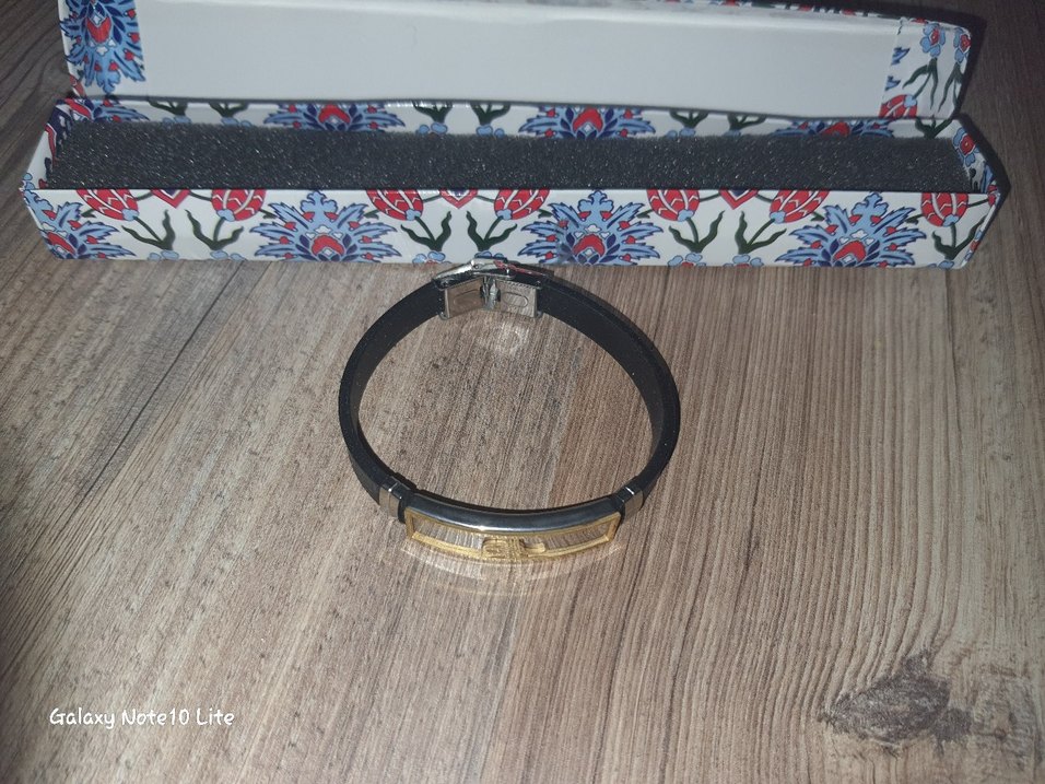 Siyah bant ve altın detaylı, retro ve bohem tarzı yansıtan minimalist erkek bileklik.