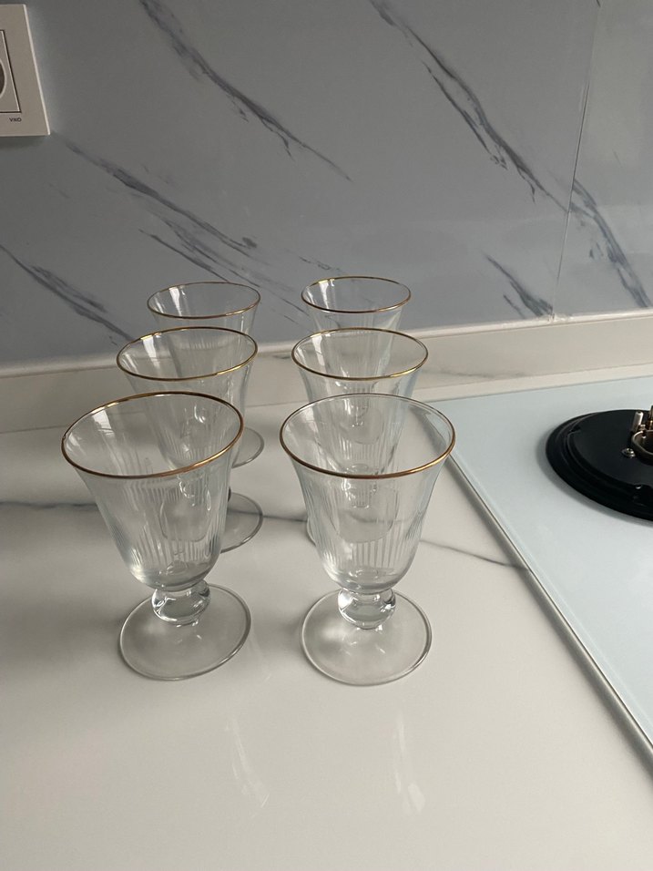 Altın yaldızlı ince kenar detayına sahip, altı parça şeffaf cam kadeh seti. Hiç kullanılmadı