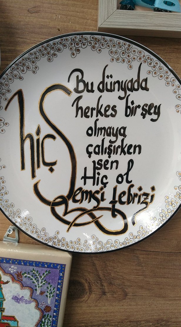 Parlak altın baskılı, geleneksel tarzda yazılı dekoratif tabak.