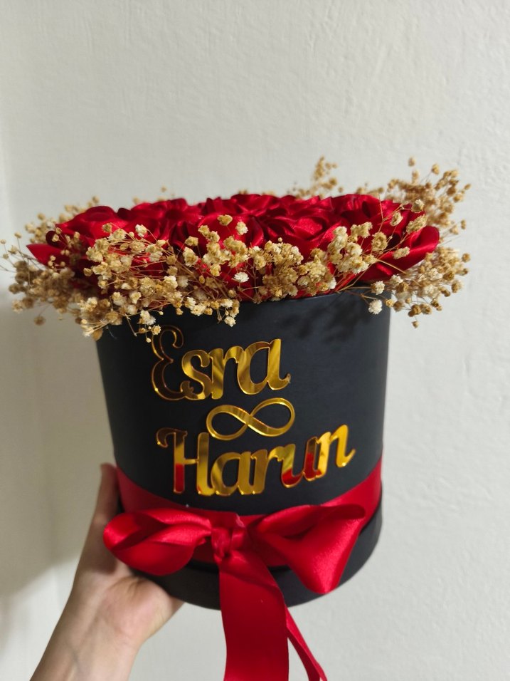 Koyu renkli kutuda altın yazı ve kırmızı kurdele ile süslenmiş, kırmızı güller ve kuru çiçeklerden oluşan aranjman. isteme çiçeği