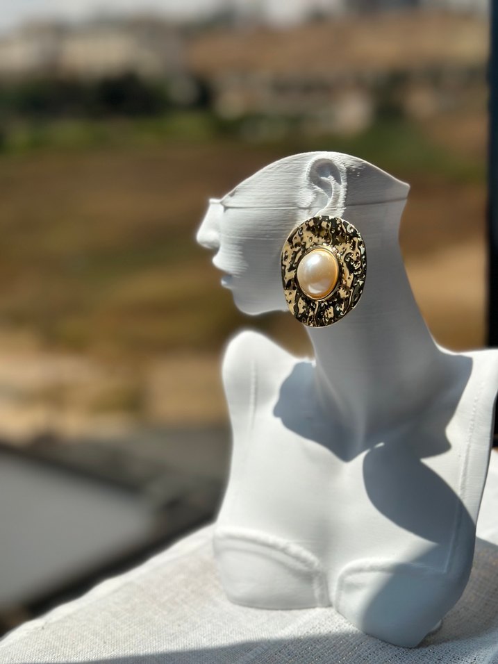 altın çelik küpe, yılan derisi desenli ve ortasında inci boncuklu, klasik zarafet ve bohem tarzı bir araya getirir.