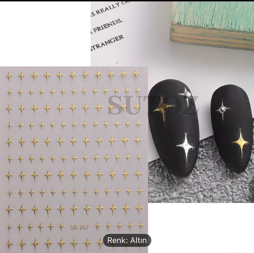 Parlak altın renkli, küçük yıldız şeklinde tırnak süslemeleri. Kendinden yapışkanlı ve tek yapraktır✨