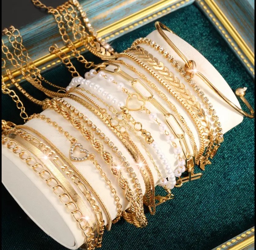 Altın renkli, zincir detaylı ve inci süslemeli bileklikler içeren bu set, düğünler için uygun, bohem ve retro bir tarz sunar. Desensiz ve ışıltılı tasarıma sahiptir. ✨