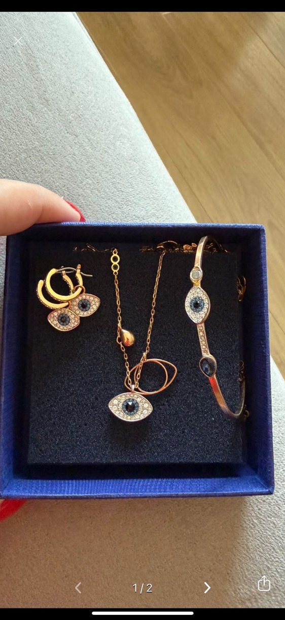 Zincir detaylı, işleme göz desenli altın tonlu swarovski takı seti
