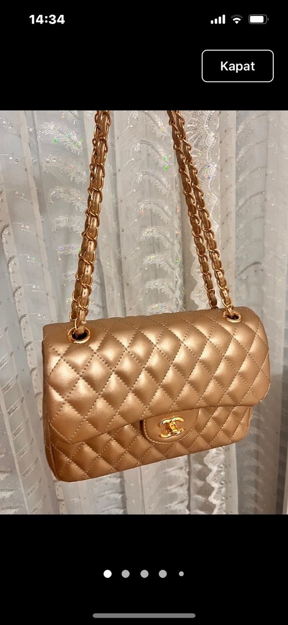 Parlak altın renkli deri kadın çanta, zincir detayları ve yılan derisi desenine sahip, modern klasik tarzda ve göz alıcı bir şıklık sunar.