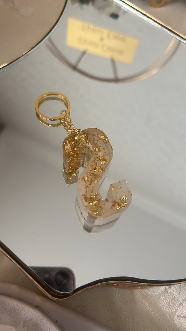SİPARİŞ ALINIR HER HARF MEVCUT Parlak altın renkli, altın parçacıklı şeffaf reçine kolye ve detaylı zincirli kadın anahtarlık.