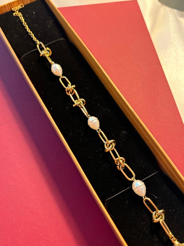 İnce bağlantılı altın zincir ve inci detaylı, minimalist bohem tarzda kadın bileklik. Romantik akşamlar için uygun. ✨