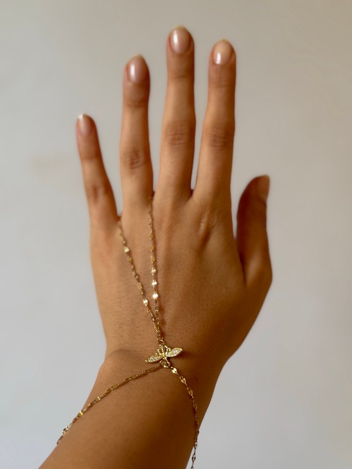 Altın renginde, zincir detaylı ve hafif yılan desenli bohem tarzda kadın el zinciri, günlük kullanıma uygun. ✨Çelik üründür. Kararma yapmaz