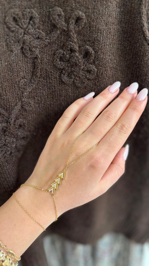 Altın renkli, zincir detaylı ve ok şeklinde süslemelere sahip kadın el zinciri, minimalist ve bohem tarzı yansıtır.