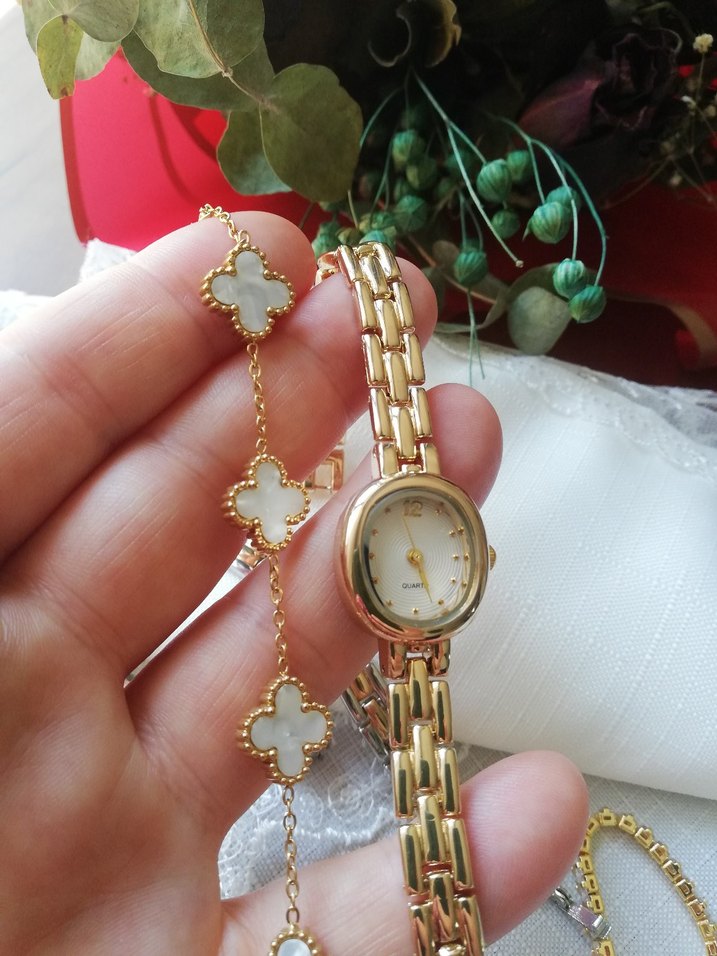 Altın renkli, zincir detaylı bilekliği ve oval kadranıyla klasik zarafeti bohem tarzla birleştiren kadın kol saati. ⌚
