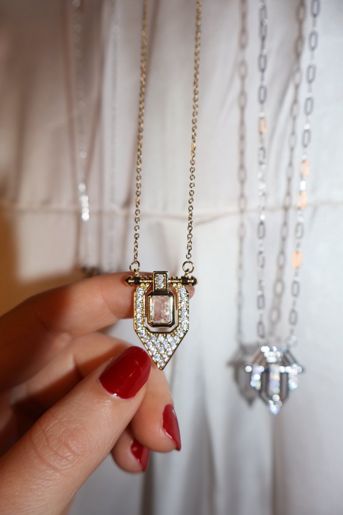 Altın renkli, zincir detaylı ve taşlı kolye. Günlük kullanıma uygun kısa uzunlukta.