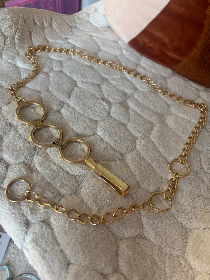 Parlak altın renkli, yılan derisi desenli halka detaylı kadın vücut zinciri, günlük kullanıma uygun.