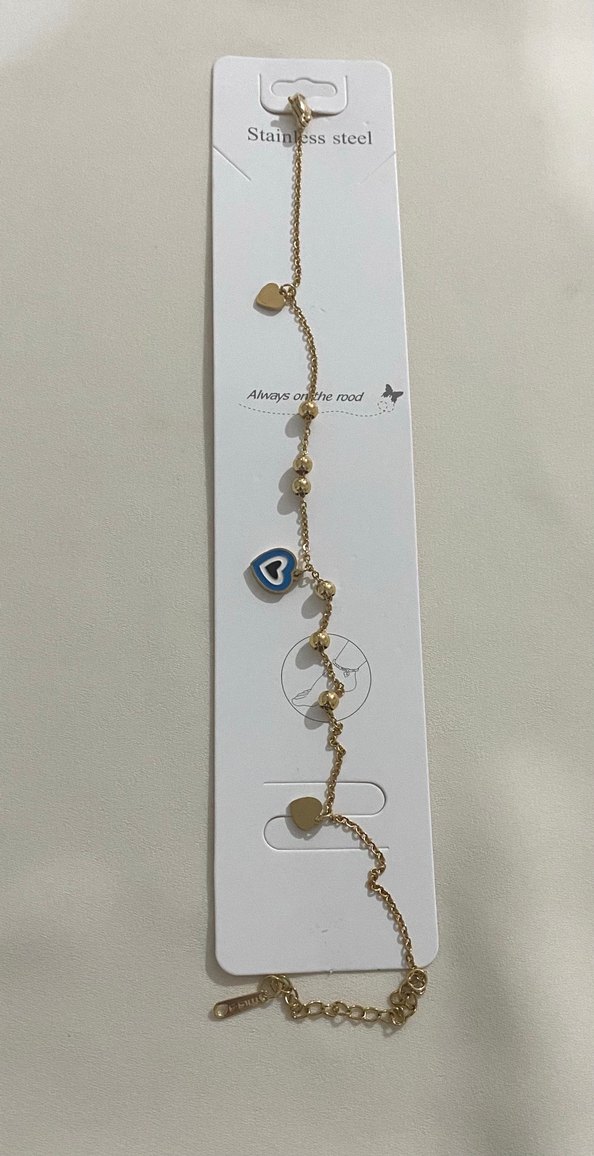 Altın zincir detaylı, kalp ve mavi kalp figürlü, yılan desenli minimalist halhal . Günlük kullanıma uygun, çağdaş tasarım.