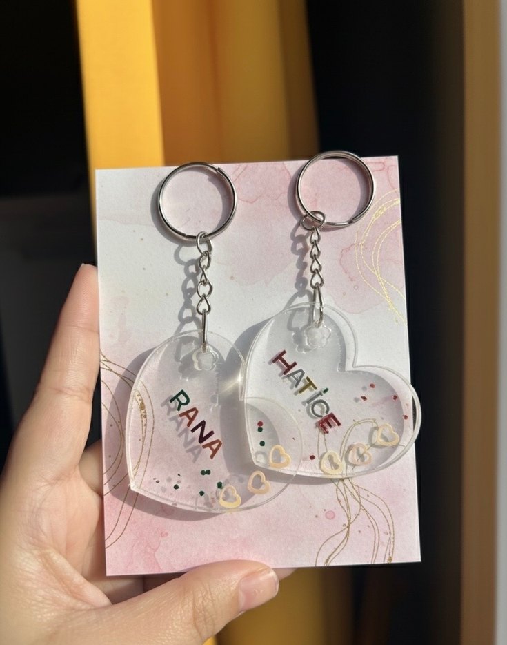Altın zincir detaylı, pastel renkli kalp şeklinde anahtarlıklar. Üzerinde RANA ve HATi isimleri bulunur. Minimalist bohem tarzda, zarif tasarım.