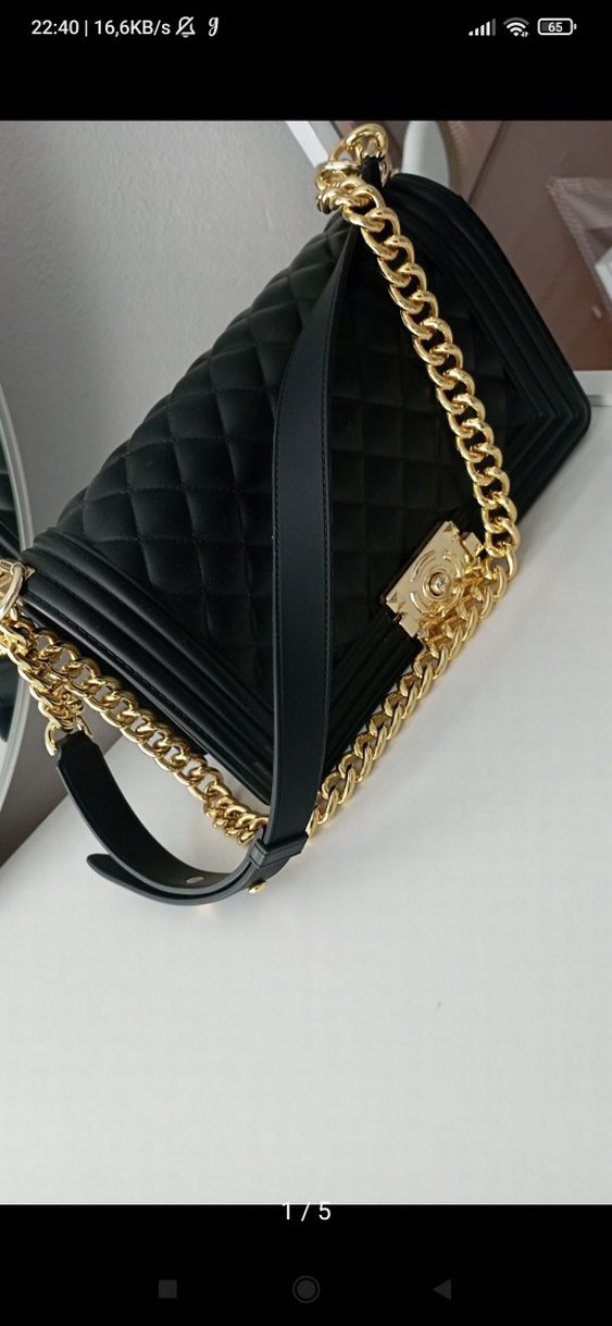 Klasik zarafette, desenli siyah deri çanta, parlak altın zincir detaylarıyla günlük kullanıma uygun.