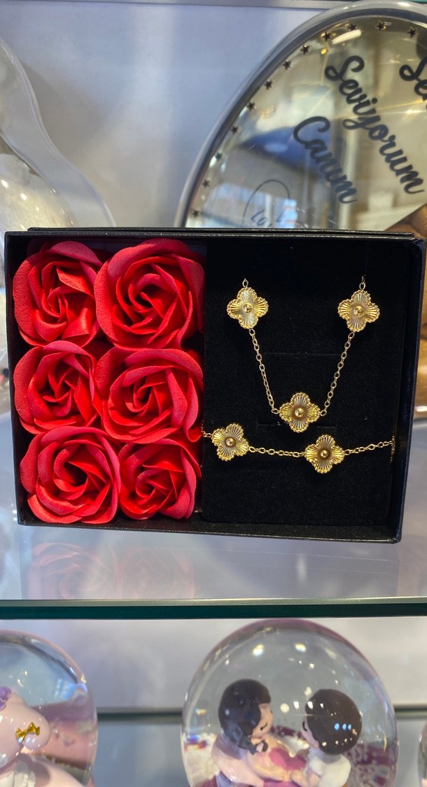 Altın renkli, zincir detaylı ve çiçek desenli kadın takı seti, kırmızı güllerle romantik hediye kutusunda sunulur.