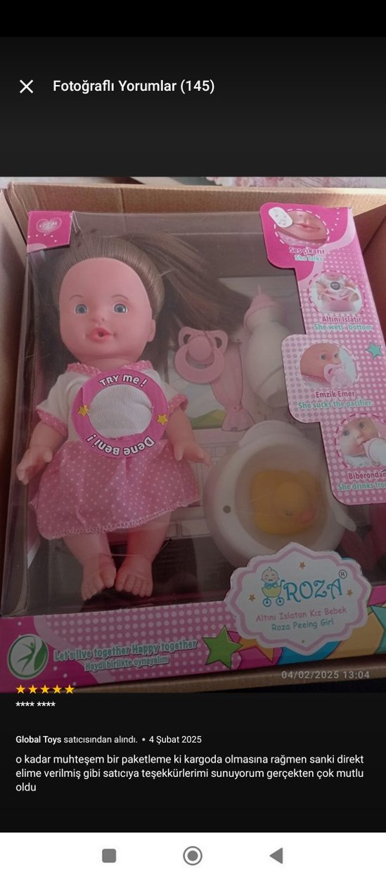 1,2 defa oynandi, tertemiz yepyeni kutulu. pek ilgisini cekmedi. agliyor gibi ses çıkarıyor, biberonla su verince alttan cis yapıyor.