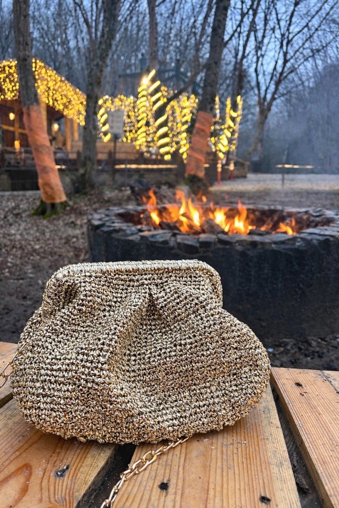 Kahverengi örgü malzemeden yapılmış, bohem tarzda, yılan deseni detaylı kadın portföy çanta. Dış mekan kullanımı için uygun.