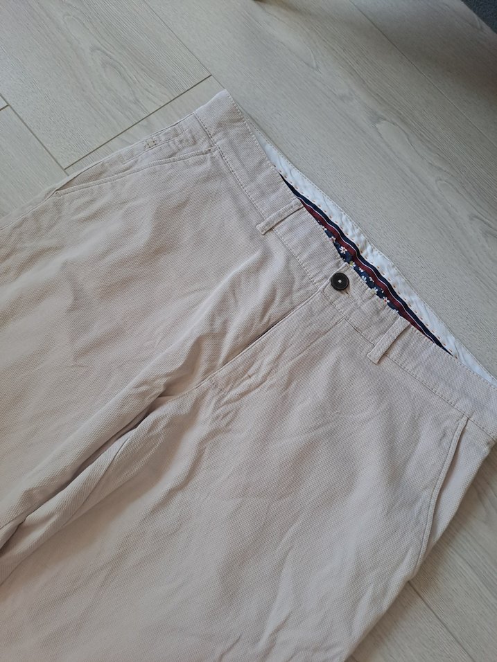 Bej renkli, pamuk kumaştan yapılmış, düzenli kesim erkek pantolon. Düğmeli kapama ve desensiz tasarıma sahiptir, günlük rahat kullanım için uygundur.