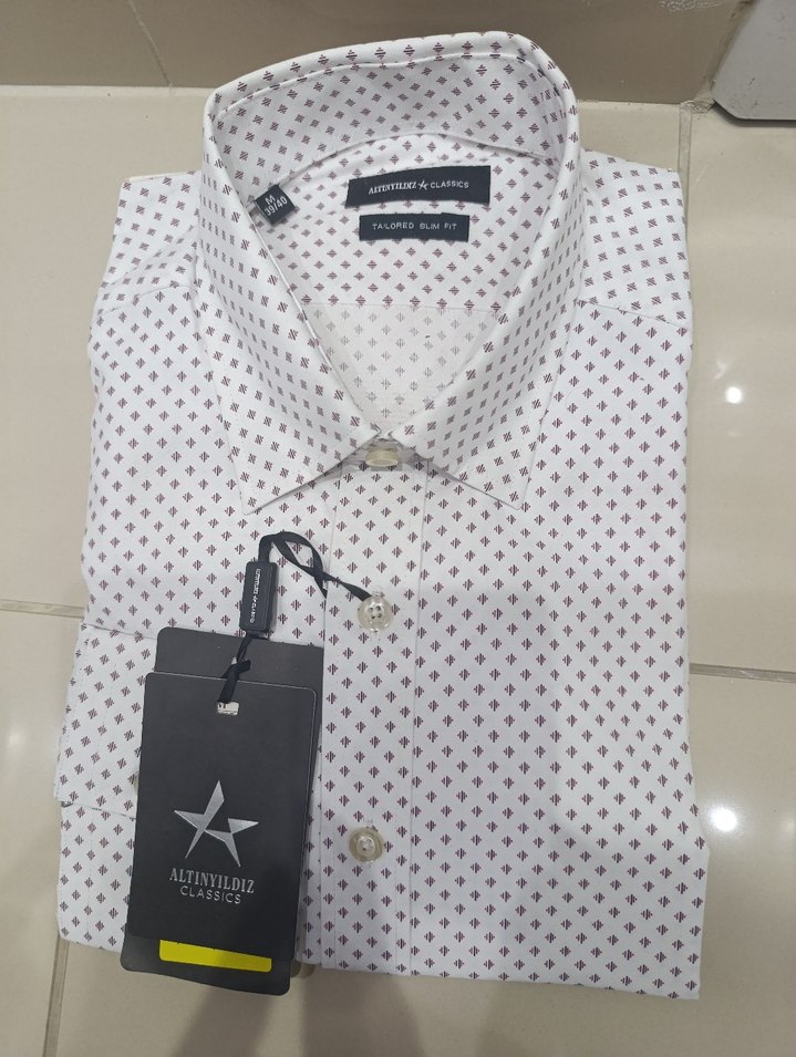 Altınyıldız markalı, beyaz zemin üzerine desenli, uzun kollu ve yakalı erkek gömleği. Düğmeli önü ve normal boyu ile ofis ve günlük kullanıma uygundur.
