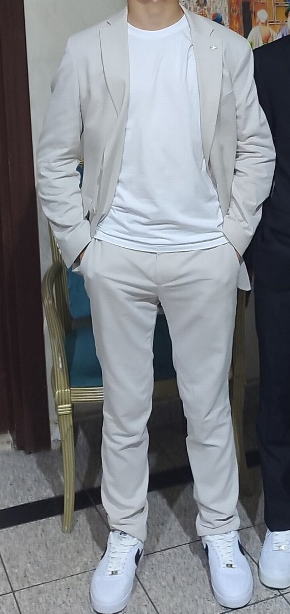 46 beden krem renkte, regular fit, normal boyda, uzun kollu ve yakası notalı erkek takımı. Desensiz, trend ve rahat bir şıklık sunar. ️