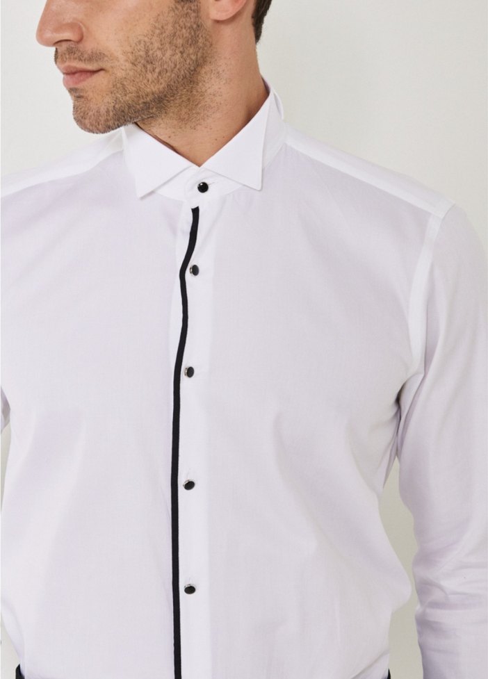 Düğmeli ve siyah detaylı beyaz erkek ofis gömleği, notched lapel yakalı, uzun kollu ve regular fit. Pürüzsüz sentetik kumaştan, çağdaş tarzda. papyonda istenirse gönderilecek. 1 kez düğünde giyildi.