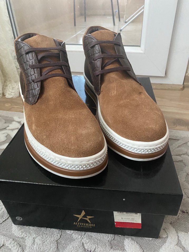 Kahverengi süet deri erkek botu, tokalı beyaz taban detaylı, modern sokak tarzı görünüm sunar. 42 numara 43 e de olur