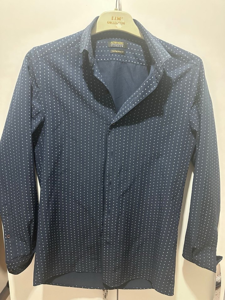 Lacivert renkte, düğmeli, uzun kollu ve notched lapel yakalı erkek gömleği. Sentetik kumaş ve regular fit ile ofis kullanımına uygun, ince noktalı desenli.
