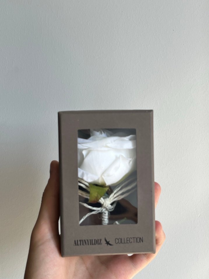 Altınyıldız Koleksiyonu'ndan gri kutuda beyaz gül şeklinde dekoratif yaka çiçeği, papyon, kuşak