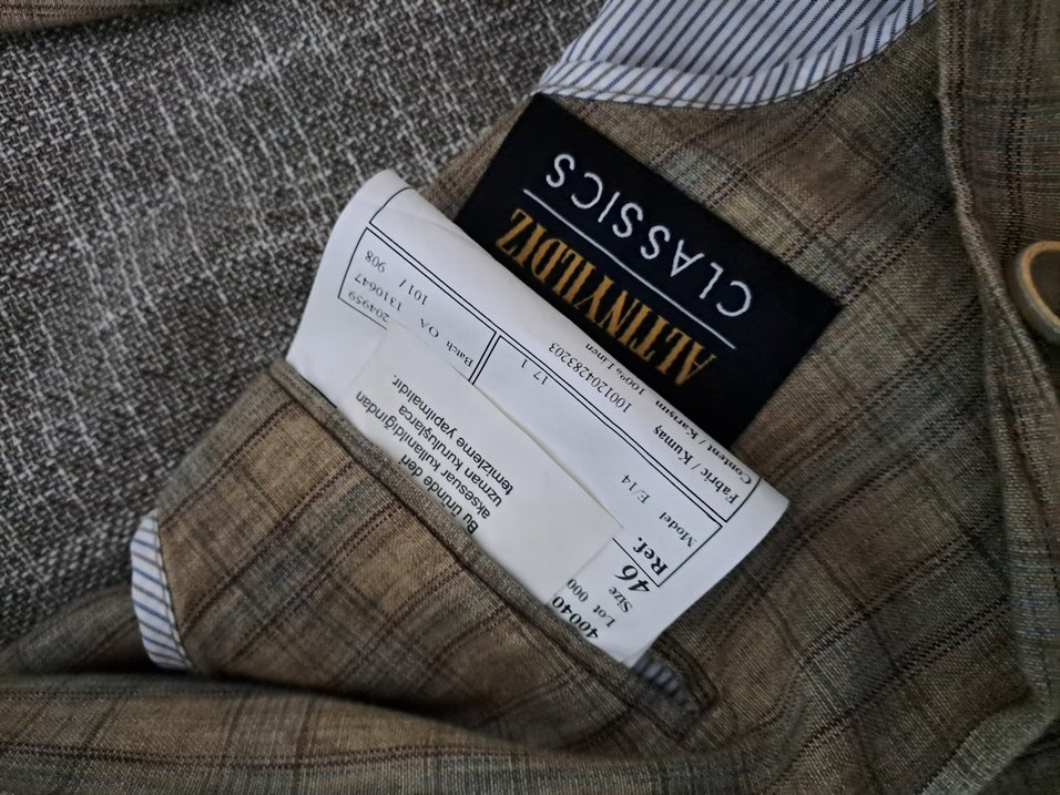 Desenli, klasik görünümlü bej baharlık ince ceket Alındı denendi beden dar geldi hiç kullanılmadı 1.80 boy 75-80 kg arasi tam olur. 85 kg 180 cm birine dar oluyor.