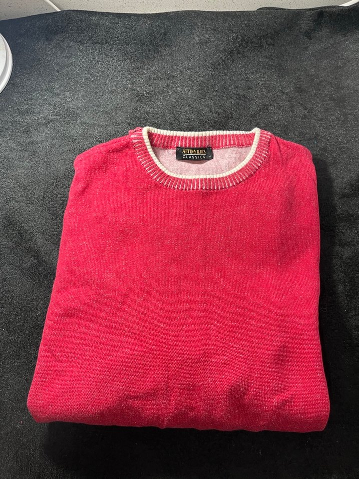 Kırmızı renkli, yuvarlak yaka ve uzun kollu, bol kesim kadın triko sweatshirt. Yumuşak ve sıcak örme kumaştan üretilmiştir, günlük rahat stil için uygundur.
