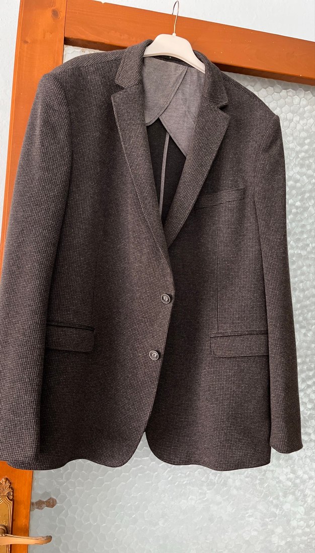Bu erkek ceket, klasik kesim ve düğmeli ön kısmı ile uzun kolludur. Ofis kullanımı için uygun, desen içermeyen gri tonlardadır ve normcore tarzını yansıtır. 60 beden az kullanılmıştır