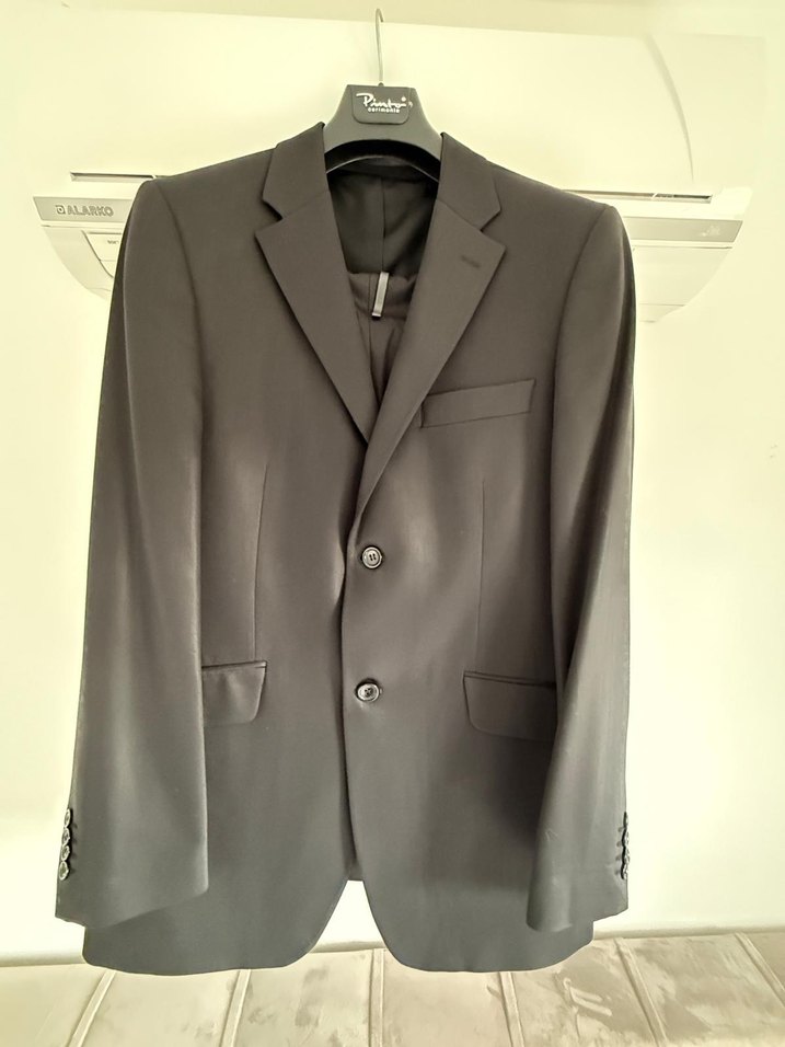 Siyah renkli, düğmeli erkek takım elbisesi, klasik ve modern tarzda, normal uzunlukta ve uzun kolludur. Bir kez giyildi.
