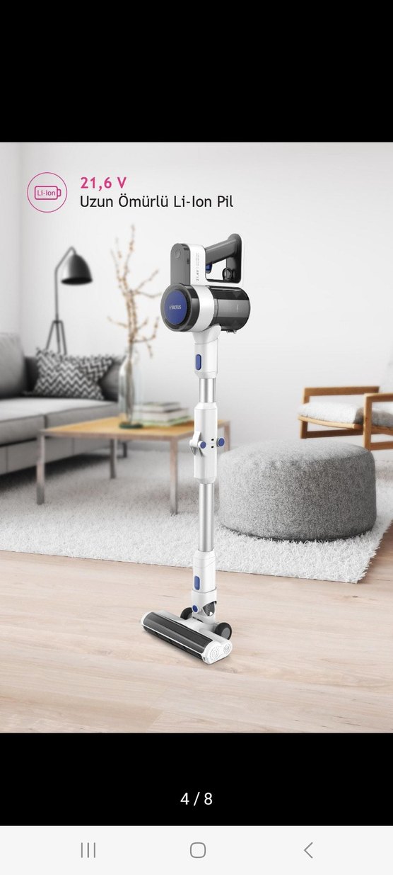 21,6V uzun ömürlü Li-Ion pil ile çalışan beyaz kablosuz elektrikli süpürge, hafif tasarımıyla etkili temizlik sağlar. Kutusu ile birlikte verilecektir. Herhangi bir sorunu yoktur. Bataryası iyi durumdadır. Çekiş gücü güzeldir. Işıklı modeldir