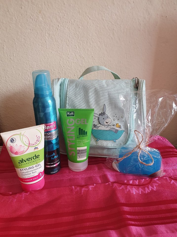 BENRİ Saç Köpüğü – Güç: 4 | Tam dolu Türk markası KULT Styling Gel – Ultra güçlü tutuş, Güç: 4 | %75 dolu DM Alverde Styling Gel – Güç: 3 | Sadece 1-2 kez kullanıldı Hepsiyle birlikte şık bir kozmetik çantası (YENİ) _ Ayrıca DURU markalı okyanus kokulu sabun da hediye olarak geliyor ☺️