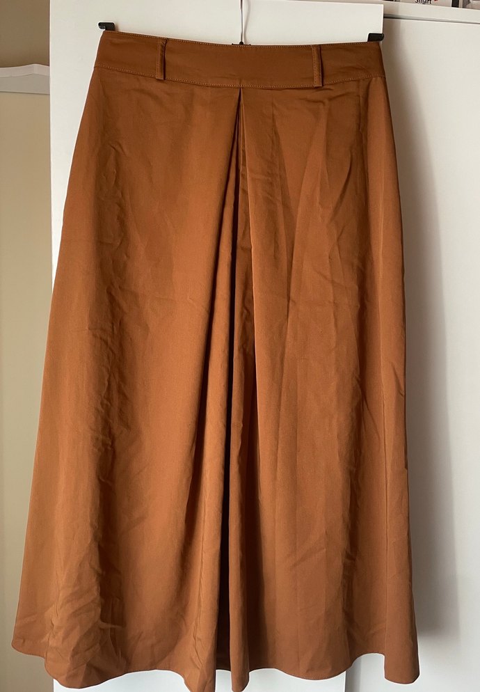 Kiremit renkli, drapeli ve bol kesimli uzun kadın eteği, ofis için uygun sade ve şık bir seçenek. ✨