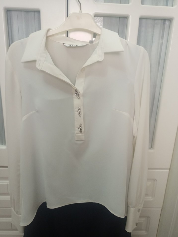 Düğmeli, yaka detaylı beyaz kadın gömlek, uzun kollu ve bol kesimdir. 55 kiloda giyilmiştit.Terletmeyen kırışmayan kumaştan üretilmiş.Özel günlerde kullanılır.