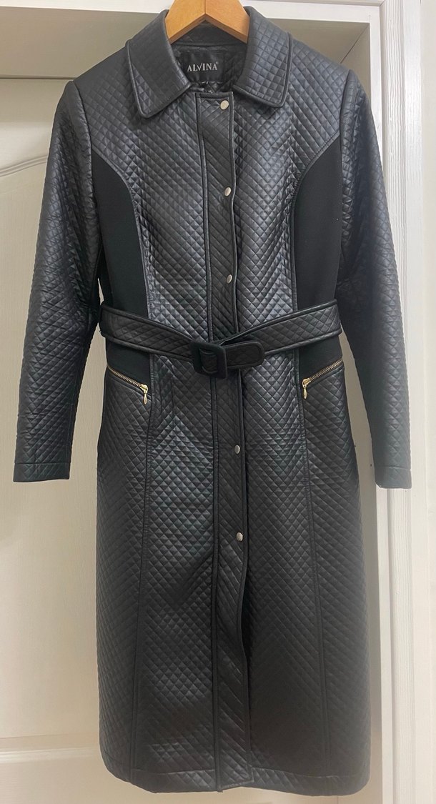 Siyah deri kaban, kapitone desenli ve kemerli bel ile regular fit. Uzun boy, kırmalı yaka ve askılı kollara sahip, fermuar ve çıtçıt detaylıdır iç kısmı astarlıdır omuzdan etek ucu boyu 106 cmdir cep kapalıdır 38/40 beden uygundur