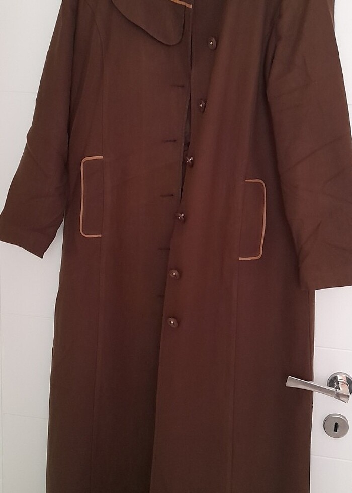Kahverengi sorunsuz bir manto. Sadece astarı boya olmustu. Ters cevirip diktim. 44 uyumlu.