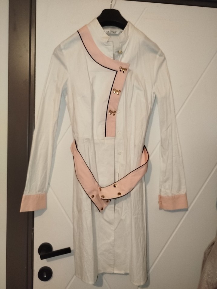 Midi boy beyaz kadın tunik, regular fit ve bisiklet yaka, pastel pembe detaylara sahip. Fiyonk detaylı düğmeler ve uyumlu kemer içerir. Kemer çıtçıtlıdır. Yaka çıtçıtının dikişleri açılmıştır. Giyilmeden önce ufak bir işlemle sağlamlaştırılmalıdır. Onun dışında sorunsuz taş gibi tunik. 40 beden uyumlu.