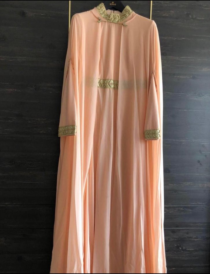Somon rengi Ürün Alvina markadır Sadece 2 kez kullanılmıştır, pelerini çıkarılıp sadece elbisesi de kullanılabilir bileklerde boyunda ve bel kısmında taş detayları mevcuttur bileklerdeki taşlardan sadece biri düşmüştür ancak belli olmuyor son fotoğrafta mevcuttur
