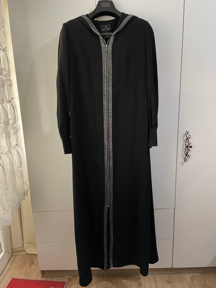 42 beden, boy 135cm, göğüs 47cm, Basen 52 cm, Kol omuzdan 67cm. Kapüşonlu ve cepli. Az kullanıldı.
